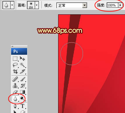 8、选择模糊工具,强度设置稍微大一点,画笔大小也调大一点,如下图。