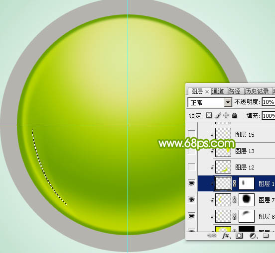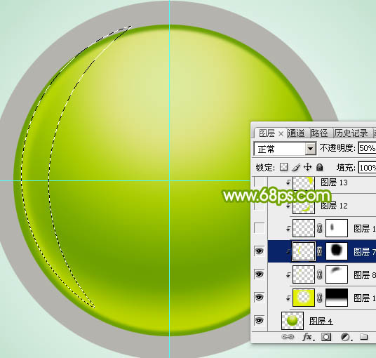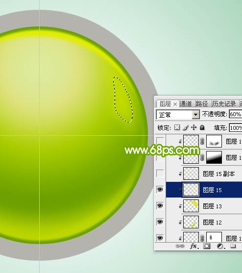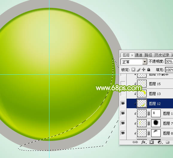 12、新建一个图层,用钢笔勾出下图所示的选区,羽化2个像素后填充同上的黄绿色,取消选区后添加图层蒙版,用透明度较低的黑色画笔把一些不需要的部分涂掉,再降低图层不透明度,效果如下图。
