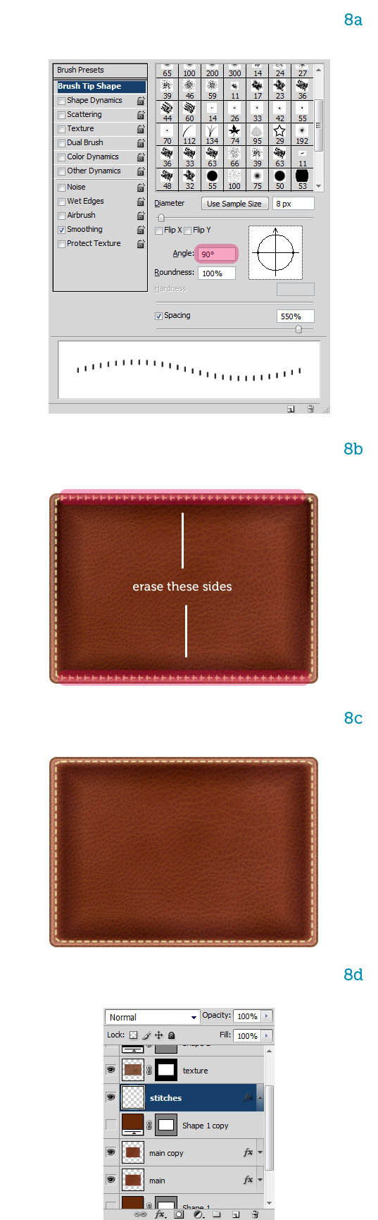 8、再新建一个图层,选择画笔工具,调出画笔预设对话框,将角度调成90°,用上面同样的方法做出左右两边的缝合线,再用橡皮擦把上下的缝合线擦除,缝合线的制作就完成了,把这两个图层合并,命名为“stitches”。