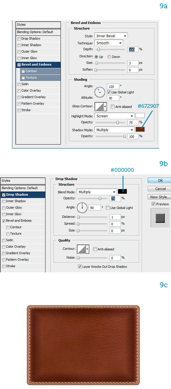 9、现在的缝合线看起来有点平,没有立体感,我们给它添加点图层样式。双击“stitches”图层弹出图层样式对话框,添加一个斜面和浮雕效果,设置如9a所示;再添加一个投影效果(9b)。