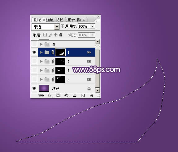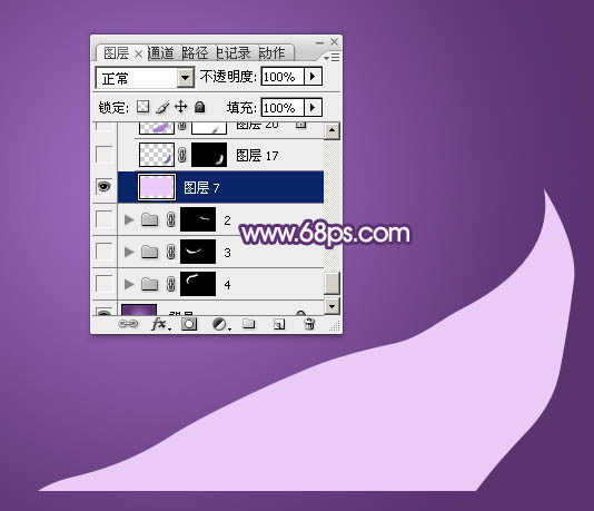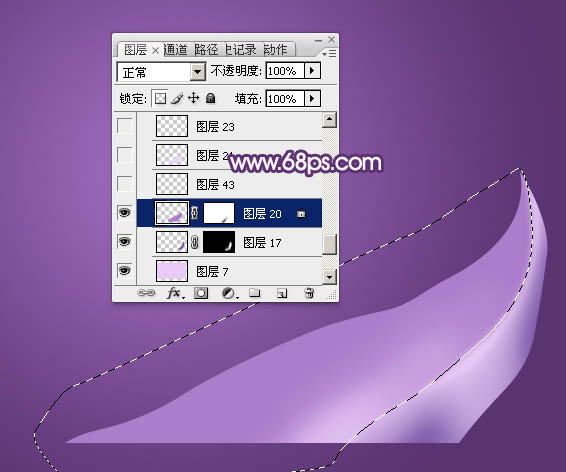 6、新建一个图层,用钢笔勾出下图所示的选区,羽化3个像素后填充暗紫色:#AB7DCB,取消选区后添加图层蒙版,用黑色画笔把底部局部擦出来,如下图。