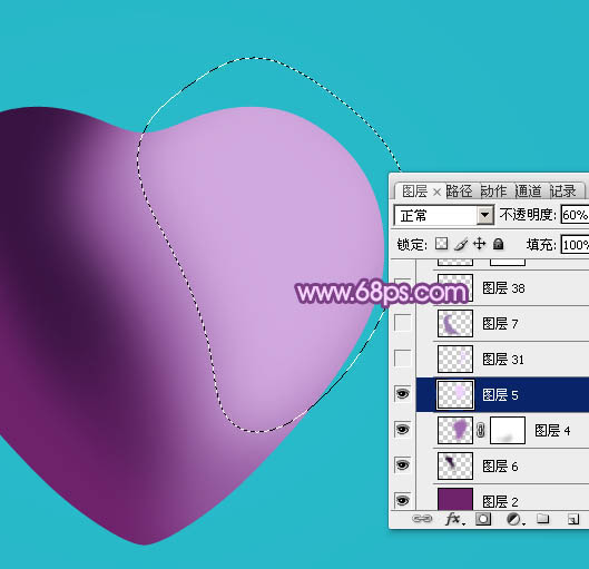 6、新建一个图层,用钢笔勾出右侧近边缘部分的高光选区,羽化30个像素后填充淡紫色:#F0D2FC,不透明度改为:60%,如下图。
