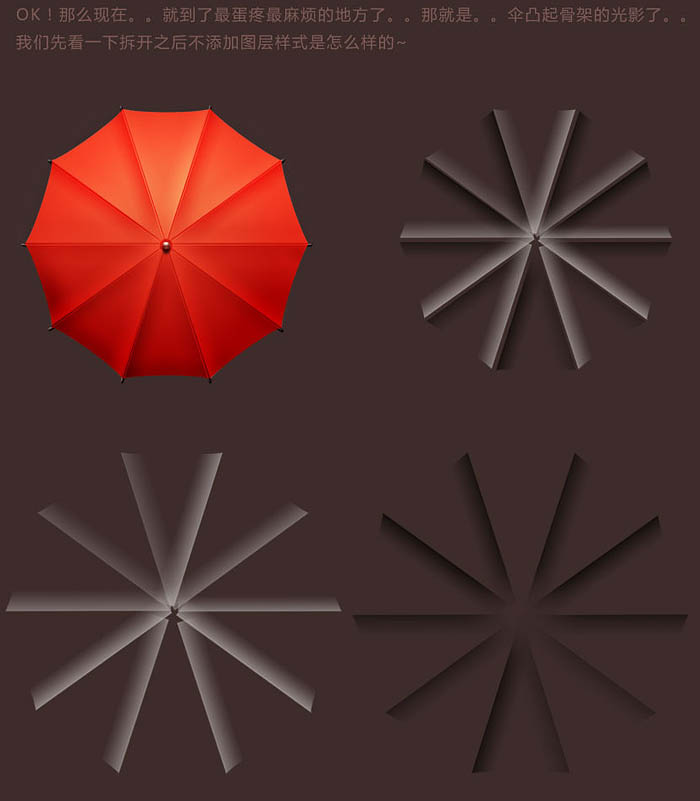 4、新建图层,再来制作伞的顶部及骨架的外缘部分,制作过程如下图。