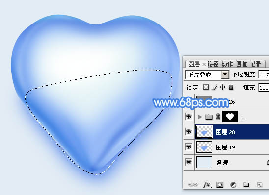 19、新建一个图层,用钢笔勾出一个稍小的选区,羽化10个像素后填充同上的蓝色,混合模式改为“正片叠底”,不透明度改为:50%,效果如下图。