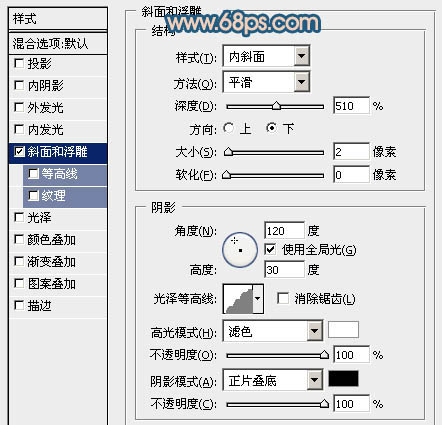 + Alt + 2 调出高光选区,按Delete 删除,取消选区后双击图层面板缩略图调出图层样式,设置“斜面和浮雕”,参数及效果如下图。
