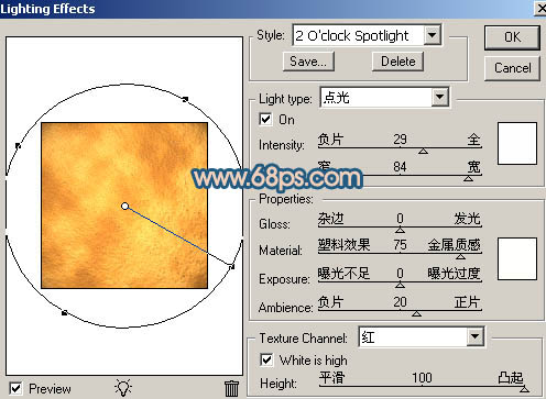 + Alt + Shift + E 盖印图层,执行:滤镜 > 渲染 > 光照效果,参数设置如图9,确定后按Ctrl