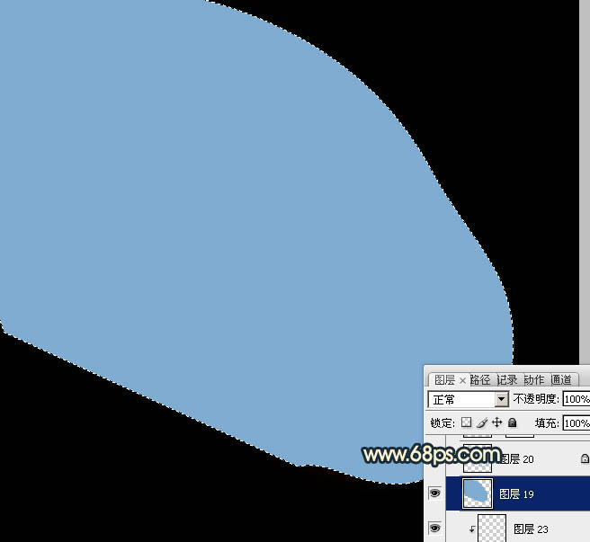 22、现在来制作烟雾部分。在组的最上面新建一个图层,用钢笔勾出下图所示的选区,填充蓝色。