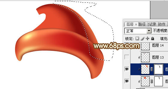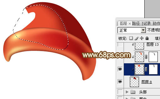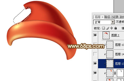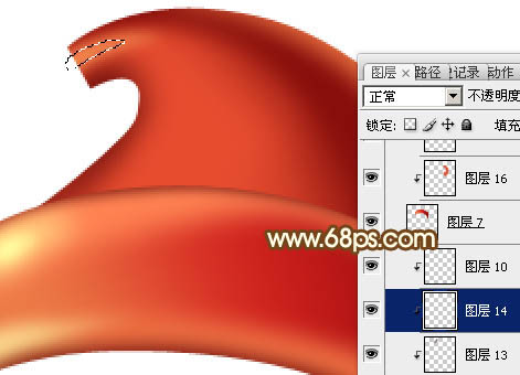 + Alt + G 创建剪贴蒙版,然后在当前图层下面新建一个图层,用钢笔勾出左侧的高光选区,羽化20个像素后填充红色。