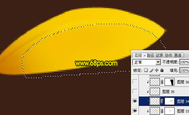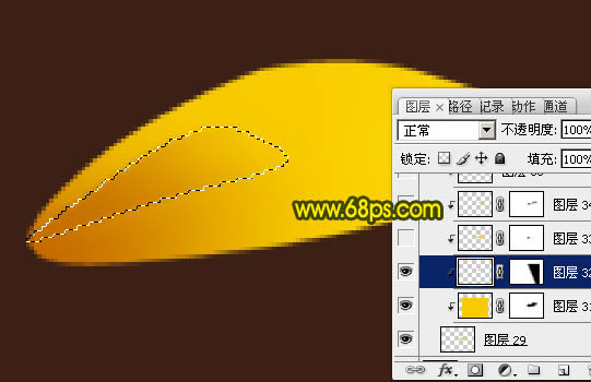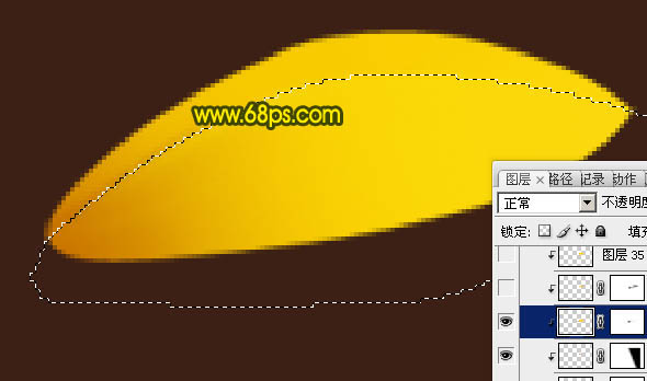 6、新建一个图层,用钢笔勾出下图所示的选区,羽化2个像素后填充橙黄色:#FBD607,取消选区后添加图层蒙版,用黑色画笔把左端擦出过渡效果。
