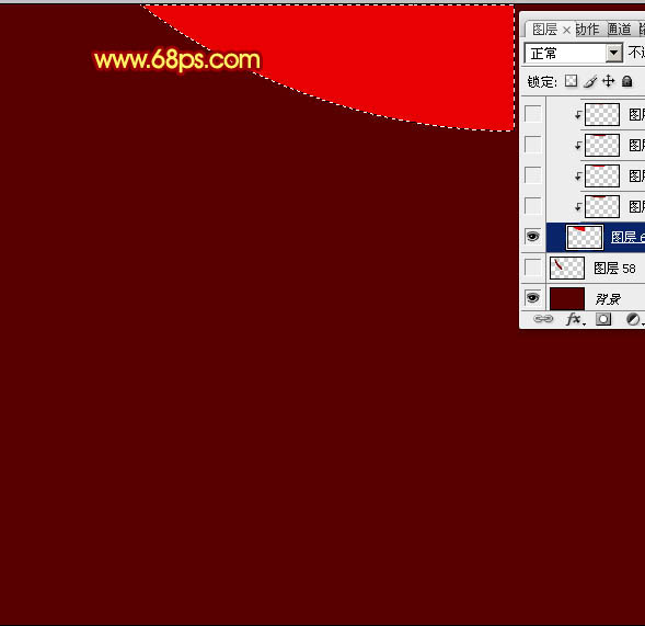 + Alt + G 与前一图层编组,然后在当前图层下面新建一个图层,用钢笔勾出下图所示的选区,羽化3个像素后填充暗红色:#900000。
