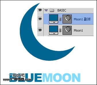 1、首先打开老外提供的初始PSD文件,解压后我们可以看到,名为BASIC的组里有3个矢量层,Moon1,MOON,和BLUE。(如果没有PSD文件,可以按住下图所示效果自己用PS做出来)