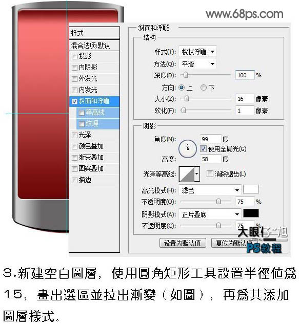3、在图层的最上面新建一个图层,使用圆角矩形工具,半径设置为15,画出选区后拉上下图所示渐变。确定后再给图层添加图层样式,选择斜面和浮雕,如下图。
