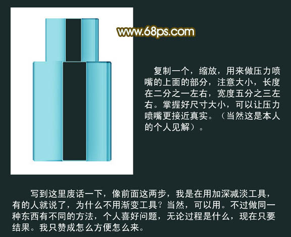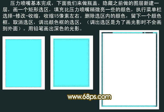 6、压力喷嘴基本完成,下面我们来做瓶盖。影藏之前做的图层,新建一个层,画一个矩形选区,填充比压力喷嘴稍亮一些的颜色。执行菜单:选择