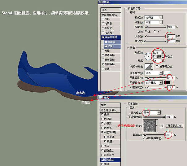 > 图层样式 > 斜面和浮雕,参数设置如下图,确定后再设置图案叠加。