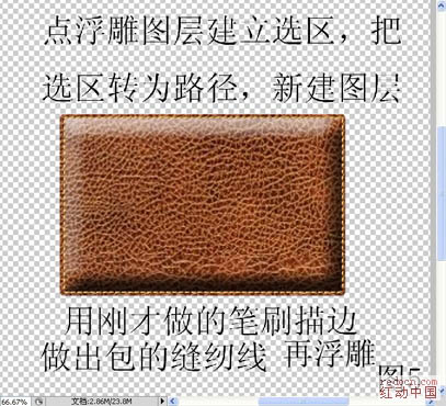7、调成浮雕图层选区,回到路径面板,把选区转为路径,回到图层面板,新建一个图层,右键路径用刚才做的笔刷描边路径。做出包的缝纫线,再加点浮雕效果。