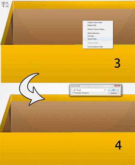10、使用大小3px绘制5px的的画笔,然后使用钢笔工具在盒子交叉的地方绘制一些直线,然后右击路径,描边路径,使用画笔描边。