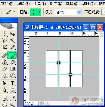 3、调整画笔大小为6像素,按大小写转换键(Caps Lock),使画笔显示为十字光标,在参考线交叉处点击,画出两个小圆。