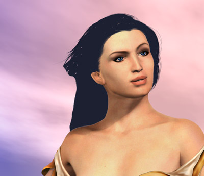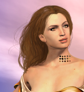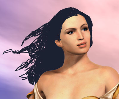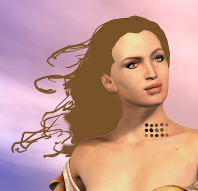 在body上建一新层,选择小的paintbrush开始画头发的草图,只要做一个大概的形状,用pen tablet,我没选择改变它的透明度和压力,所以只得到黑色的实心的线,当然看上去很乱,但不要担心,这才是开始。有时我会降低该层的透明度以便更好的看到她的头皮,这种方法使我可以肯定我没有太靠近或太远离头皮。然后我将层的透明度改回来再画。在描绘金发时,你将看到她颈上的一系列有色的点,这些点形成了我画头发的颜料。我已经打开了我的源文件,一张真实头发的照片,提取了一些样本色(高光的,中间色的和阴影部分的头发颜色),现在我将用在我的图中。无论何时我作画要选颜色时,都要按住CTL键让brush变为eyedropper,不按CTL键,就会转回paintbrush,,我又可以继续画了。深色的头发现在还是维持深色,你可以注意到二张图眼睛颜色的不同,我决定用蓝色的眼睛。只是为了不用的例子这样去做的,因为很有趣!