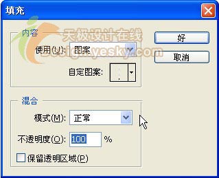 3、新建一个文件。新建图层1,执行菜单栏中的“编辑”“填充”命令,设置填充对话框效果如图02所示,
