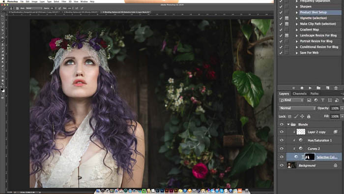 17、同样地,我们也可以在PS中将头发颜色转换为红色或紫色。在这一点上,是很有可能将头发颜色转变为铜红色或者不自然的紫色。点击色相/饱和度调整图层,确保你处于红色通道(不是蒙版),同时移动色相滑块以获得更加自然的色调。