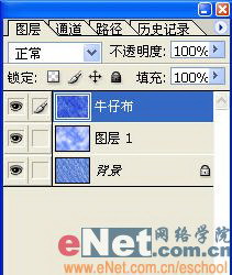 3、同时选择背景层和图层1,然后一起复制,完成后将两个复制层合并,命名为牛仔布,效果如图04所示。
