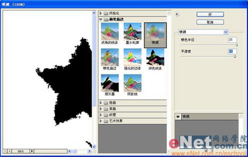 7、保持对蒙版的编辑状态,执行菜单栏中的“滤镜”“画笔描边”“喷溅”命令,在弹出的对话框中设置参数如图10所示,画面效果如图11所示。