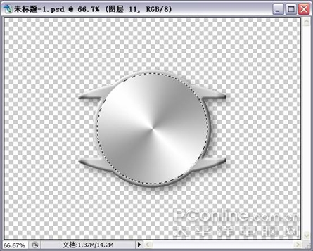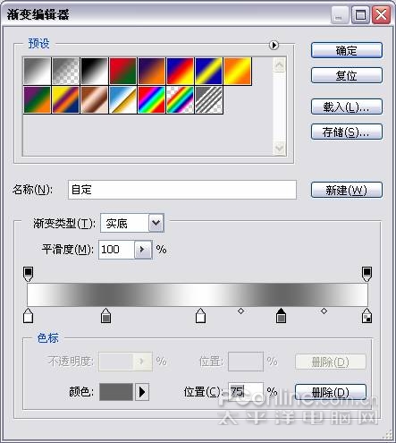 11. 在新图层上用自定形状工具中的椭圆工具,按住SHIFT键画个圆,设置渐变器如下,用角度渐变,自中心向外至下呈半弧拉动。(图14、15)