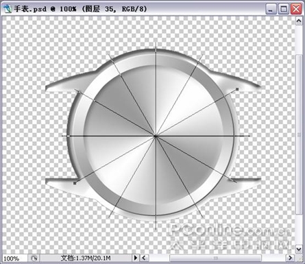 17. 现在开始制作刻度,在新图层上用自定形状工具中的直线工具画出米形线条(为了准确放刻度的位置)用完后删除掉。(图21)