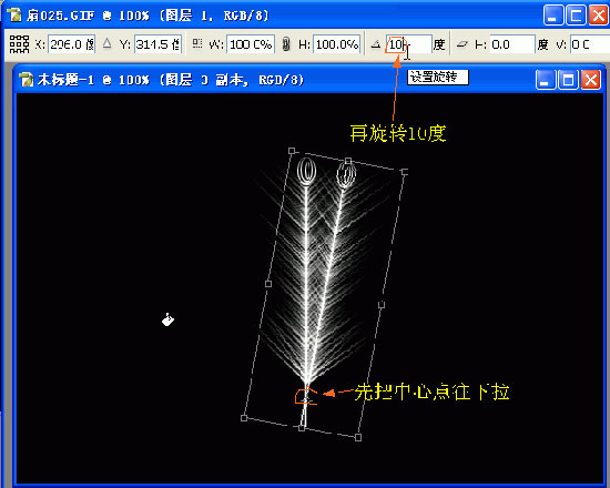 17、复制图层1(得出图层1副本),按ctrl+t,把中心点往下移,再旋转10度,按回车确定。