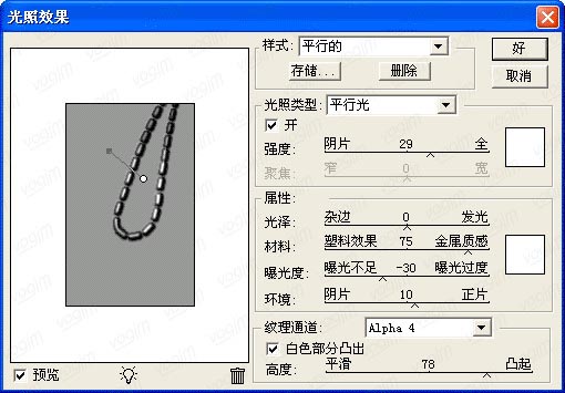 26.然后把所有链子的图层合并,并在合并的图层上面新建一个图层,填充为米灰色,不要取消选区,然后将前景色设置为黑色,背景色设置为白色,执行菜单-滤镜-渲染-云彩,再到通道面板,新建一个通道,填充为白色,用三次高斯模糊,参数同先前的一样,再带菜单-滤镜-渲染-光照效果设置如(图43),完成后按CTRL+F再重复执行一次(图44)。