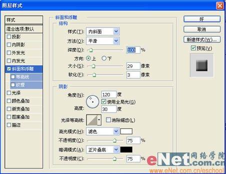 4、复制“图层1”为“图层2”,将“图层2”隐藏。按住“Ctrl”键的同时,单击“图层1”生成选区,将前景色的RGB设置为褐色,其RGB值分别为137、87、64,背景设置为白色,用前景色填充选区,取消选区,单击“图层”控制面板下方的“添加图层样式”,在弹出的菜单中选择“斜面和浮雕”命令,弹出“斜面和浮雕”对话框,在“样式”选项的下拉列表中选择“内斜面”,将“大小”选项设为29,“软化”选项设为3,其他为默认,如图04所示单击好,效果如图05所示。