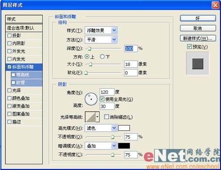 8、单击“图层”控制面板下方的“添加图层样式”,在弹出的菜单中选择“斜面和浮雕”命令,弹出“斜面和浮雕”对话框,在“样式”选项的下拉列表中选择“浮雕效果”,将“大小”选项设为18,“软化”选项设为0,在“暗调模式”下拉列表中选择“叠加”其他为默认,如图11所示,单击好,效果如图12所示。