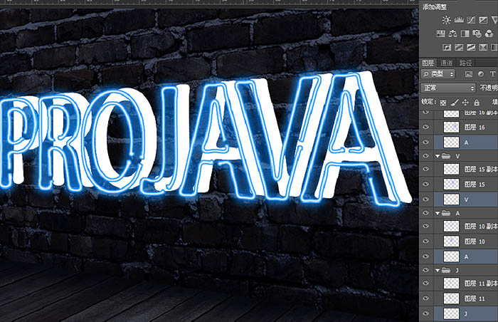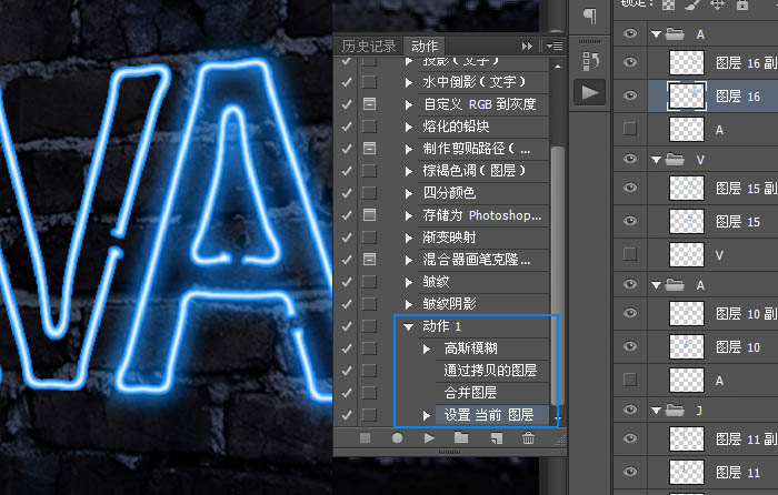 26、开始做墙上的光。点击白色字母,按CTRL+鼠标左键得到选区,填充跟发光灯管一样的蓝色。取消选区,高斯模糊63.0,复制一层,合并之后把模式改为“颜色减淡”,ok了~用录制好的动作完成后面所有的字母改造工程。蓝色框内是我录制的制作流程。
