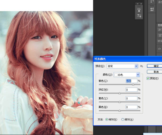 3、选择可选颜色,整体人物去黄,调的比较粉嫩一些。