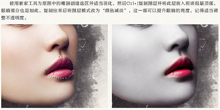 使用套索工具为原图中的嘴唇创建选区并适当羽化,然后Ctrl