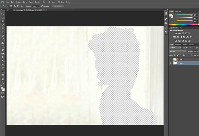 10、选中第一个图层,然后点击Delete,即可将人物从背景中去除。到这一步,我们的图层面板中总共有两个图层,最上面的那个图层是用多边形套索工具选中且复制而来的人物图层,下面的那个图层则是抠出了的背景。