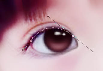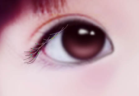 8、新建图层,用钢笔工具画出眼睫毛,楼主表示画眼睫毛是渣。画笔大小调到2~3,描边路径,再高斯模糊0.5~1,透明度调整到70~80%,效果如图。然后用步骤1的方法画出双眼皮,由于原图双眼皮本身就很清晰,这一步也可以省去。