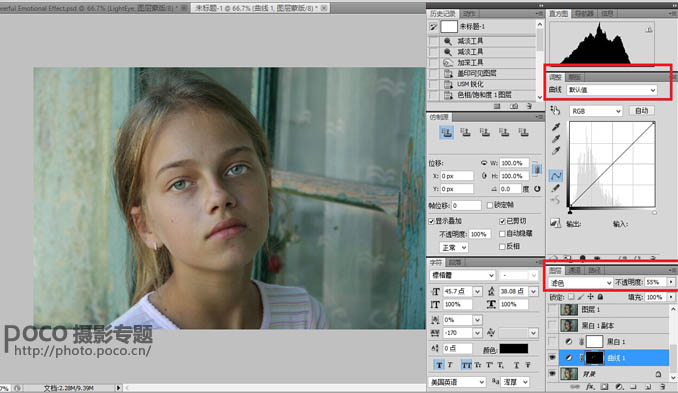 1、创建曲线调整图层(图层>新调整图层>曲线),设置混合模式为滤色。将曲线设置为默认。单击曲线图层蒙板,填充为黑色。用画笔把眼睛擦出来(要确保你已经点击到了图层蒙板)。如果眼睛太亮的话,降低不透明度(在这个特定的例子中,透明度为55%)。