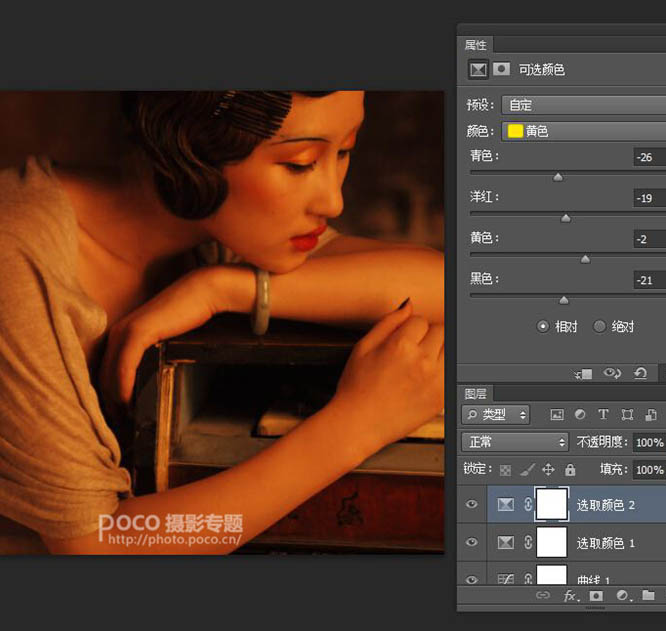 4、油画风格多数偏暖色。色彩感强烈。我们再打开可选颜色工具选择黄色通道,青色{12}、洋红{1}、黄色{85}、黑色{9}使照片颜色更加融合。