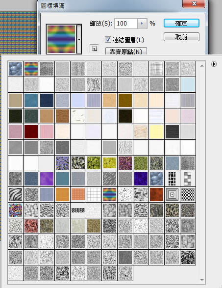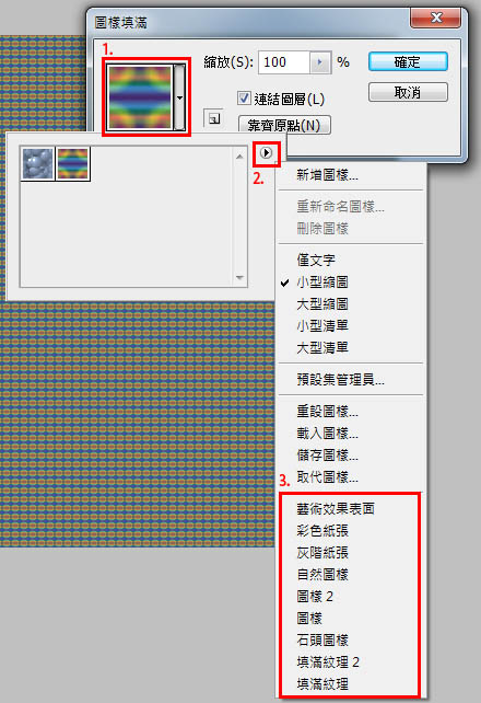 2、Photoshop里头原本的设定只有两种图样,再依照下面步骤把其它内建图样也叫出来。将所有内建的图样,选取加入。