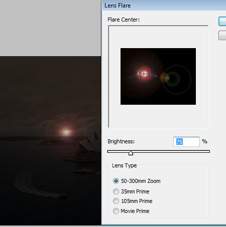 > 渲染 > 镜头光晕,选择好光晕位置,参数设置如下图。确定后把图层不透明度改为:100%。