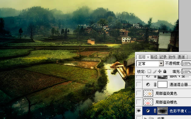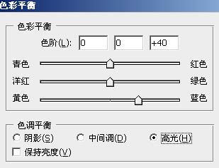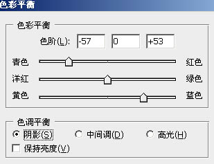 7、添加一个色彩平衡调整层,阴影(红色-57,蓝色+53)高光(蓝色+40)使用蒙版融合和下层的色调关系。
