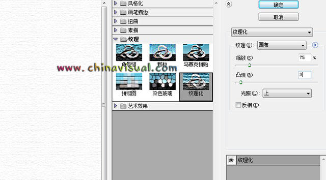 2、添加一个新图层,用白色填充。在确保前景色为白色背景色为黑色的前提下,打开滤镜>纹理>纹理化,参考下图数值设置参数。