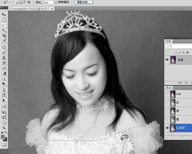 3、先用套索工具围绕头发边缘大概圈选,如图03所示。注意选择的时候背景不要选择的太多。
