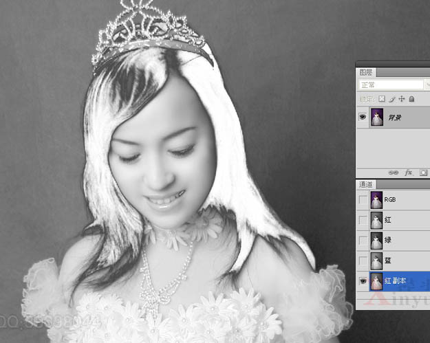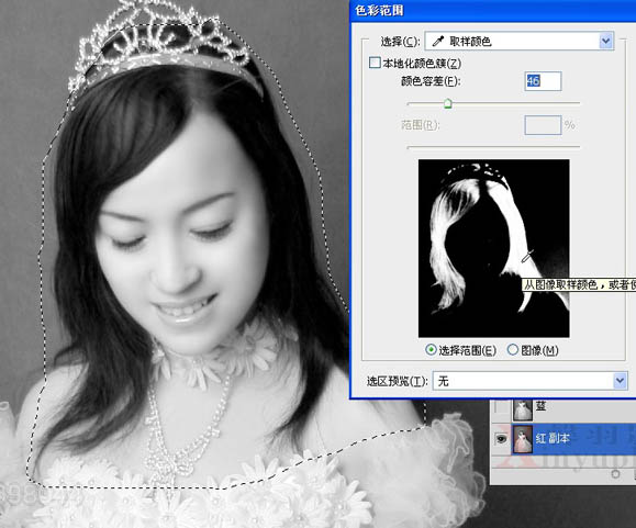 4、执行菜单:“选择/色彩范围”命令在弹出的对话框中选择头发,让头发变为白色,背景变为黑色为止(如图04所示)。这样做的目的仅仅是为了得到一个头发的选区。