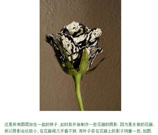 8、这是所有图层放在一起的样子。此时我开始制作一些花瓣的阴影,以往内是水做的花瓣,所以阴影会比较小。在花瓣间几乎看不到,而叶子投在花瓣上的影子则重一些,如下图。