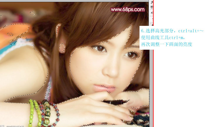 + Alt + ~ 选择高光部分,按Ctrl + M 调整曲线,适当调整一下面部的亮度。