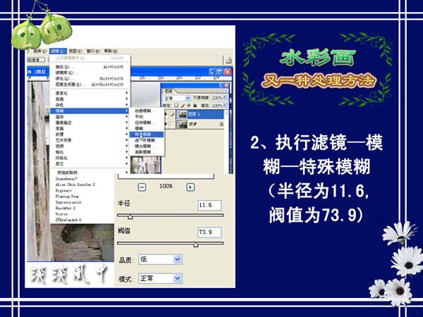 > 模糊 > 特殊模糊,半径为11.6,阈值为73.9,如下图。