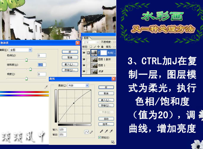 + J 再复制一层,图层混合模式改为“柔光”,然后创建色相/饱和度调整图层,适当加强全图的饱和度,数值为20。确定后再创建曲线调整图层,适当把全体调亮一点。