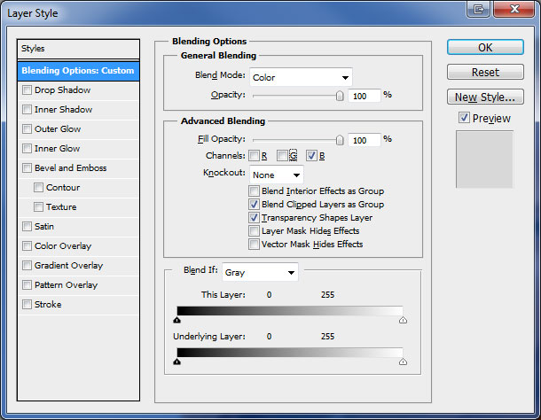 > 图层样式 > 混合选项和高级混合,删除检查从R和G通道的标志。
